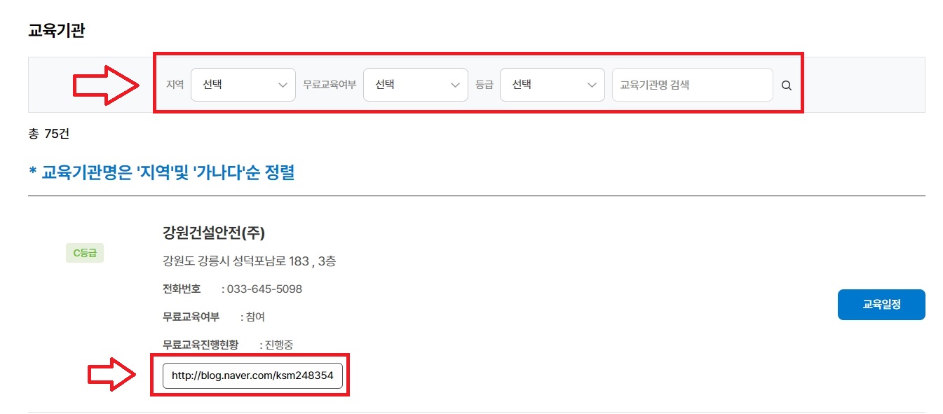 위에 안전보건공단 접속 후 아래그림처럼 지역, 무료교육여부, 등급을 선택하시면 해당지역에 교육받을 수 있는 기관명이 나타나게 됩니다.