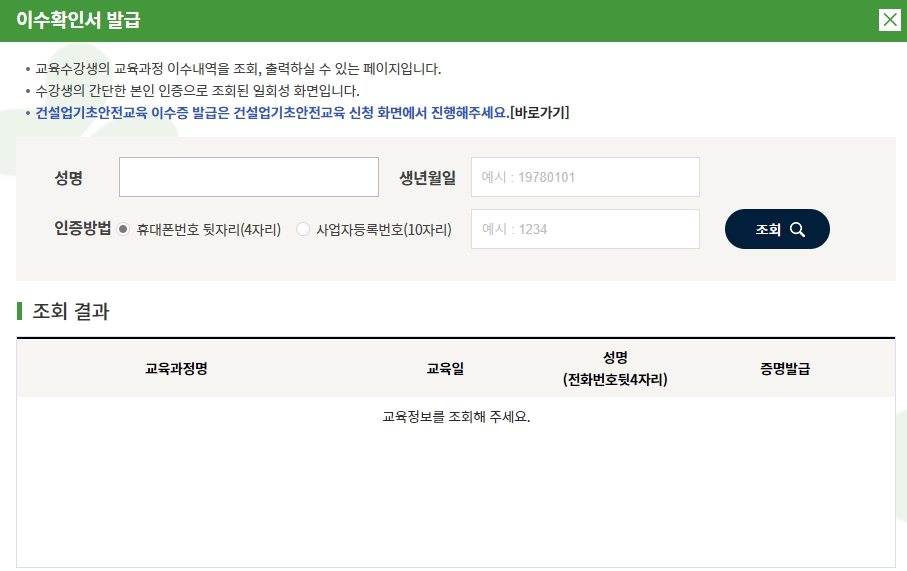 건설업 기초안전보건교육 (이수확인, 장소, 온라인, 대상, 조회, 이수증)