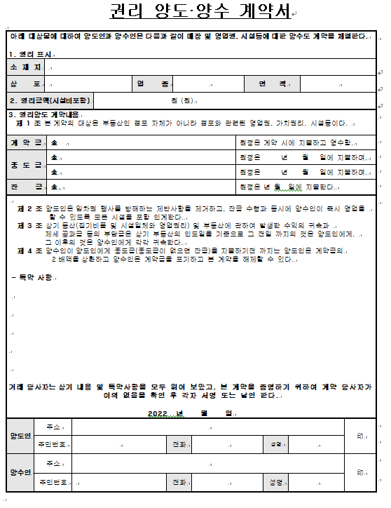 권리양도양수계약서는 양도인과 양수인과의 계약을 하기 위한 계약서입니다. 권리양도양수계약서 양식에 따라 작성해야 하며, 양도자와 양수자의 합의하에 작성하게 됩니다. 또한 작성 시에도 추가 사항을 추가하거나 변경할 수 있으니 참고하시기 바랍니다.