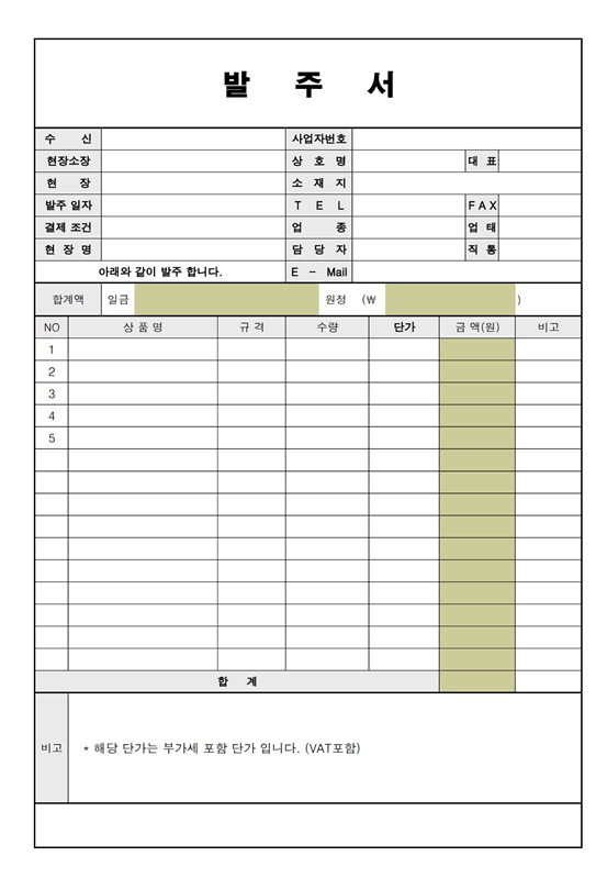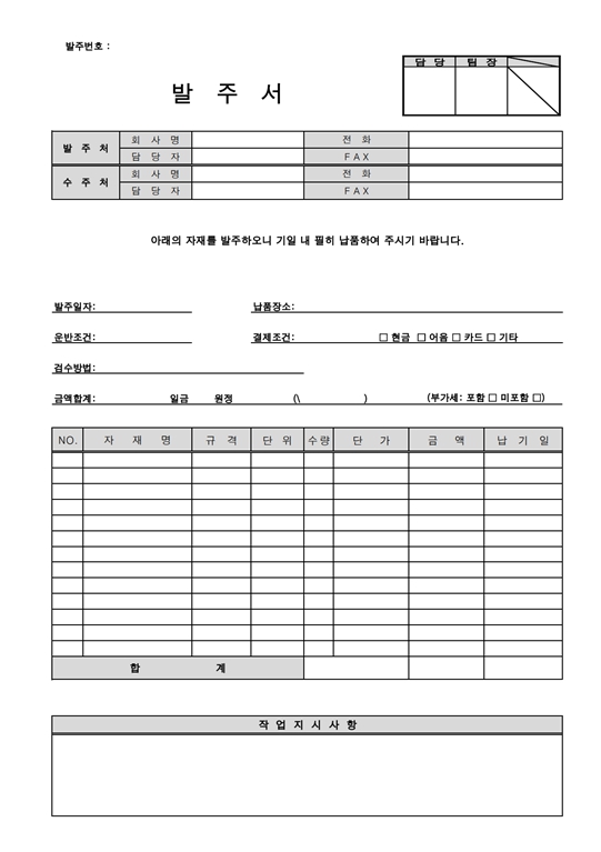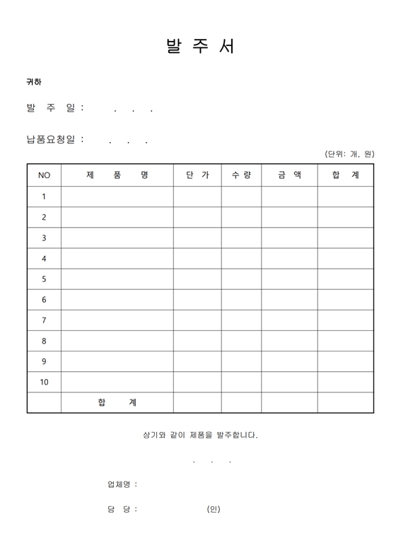 아래는 발주서의 pdf 파일과 xls파일을 같이 올려드리니 편하신 파일로 다운로드하여 사용하시면 될 것 같습니다.