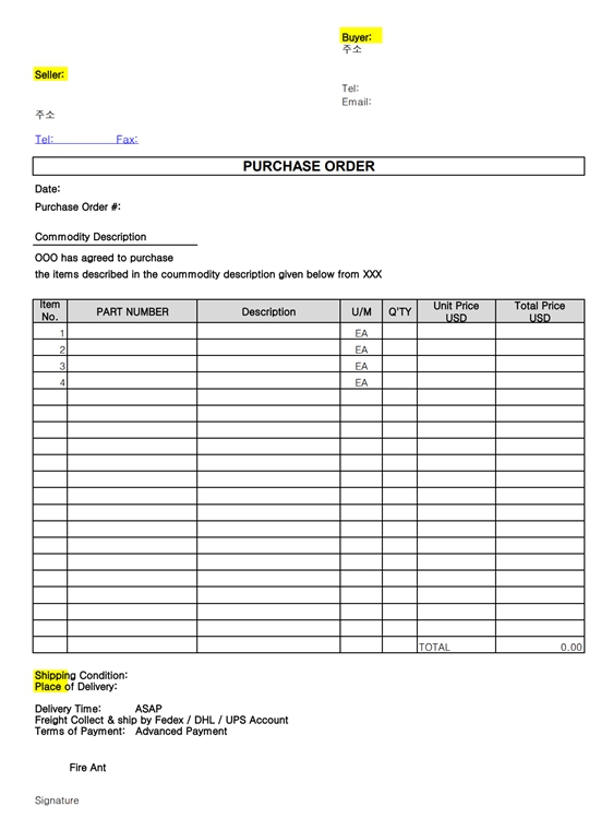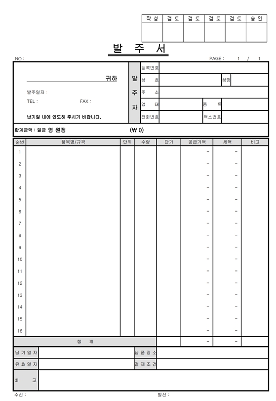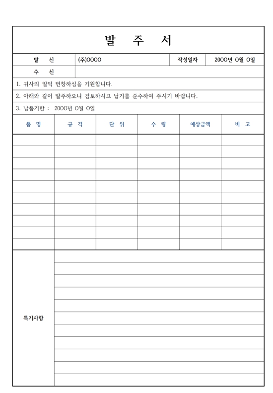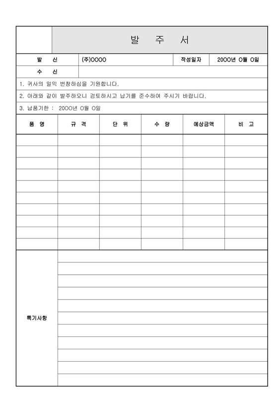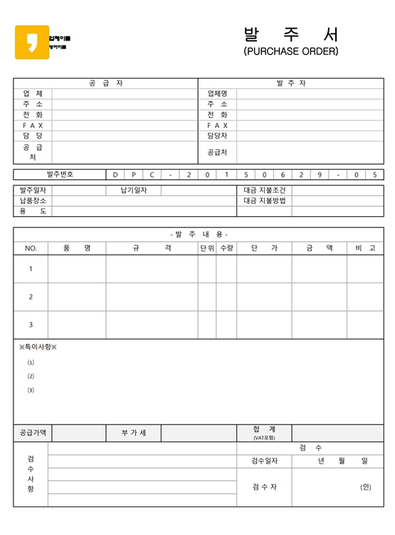 발주서의 작성은 매우 중요합니다. 한번의 실수로 1개 주문을 10개 주문할 수도 있고 날짜를 잘못 기입하면 납기도 이상한 날짜에 물품이 올 수 있습니다. 이런 중요한 발주서를 실수 없이 작성할 수 있어야 문제가 없을 것입니다.
