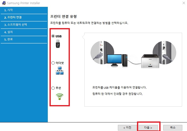 3. 프린터 연결 유형을 선택(usb, 이더넷, 무선)후 다음을 클릭합니다.