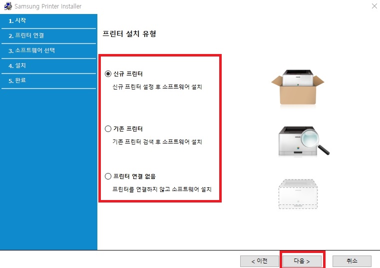 2. 프린터 설치 유형을 선택(신규, 기존, 프린터 연결 없음) 후 다음을 클릭합니다.