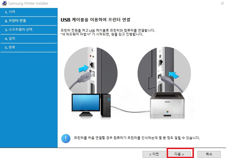 4. 아래 화면에 나온 것처럼 usb케이블을 이용하여 프린터를 연결하고 다음을 클릭하면 설치가 진행됩니다.