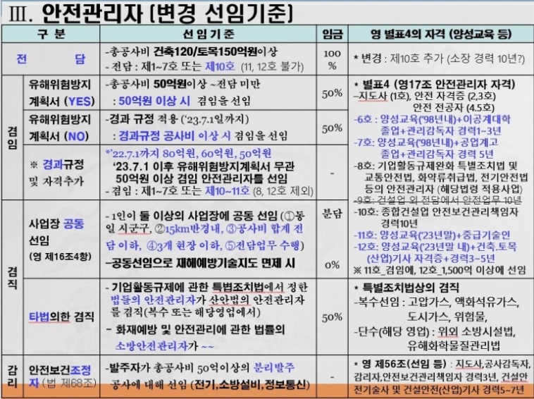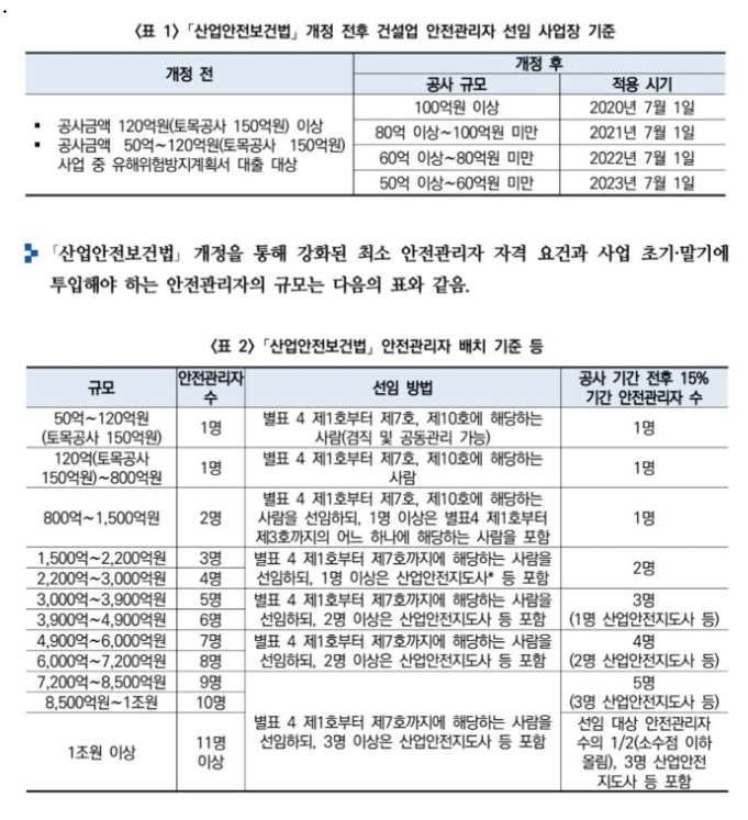 안전관리자 수급여건을 고려하여 정부에서는 2023년 7월 까지 50억 이상의 공사에는 안전관리자를 선임하도록 규정하였습니다. 현재는 모든 사업장이 안전관리자를 선임하여야 하며 하청 건설사에 대해서는 100억 원 이상 공사에 대해서만 안전관리자선임을 의무화하였습니다.