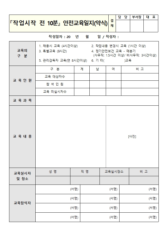 산업안전보건교육은 5대 법정의무교육에 해당하며 5인이상의 사업장이라면 꼭 받아야 하는 교육입니다. 이를 어길 경우 최대 500만 원에 과태료가 부과될 정도로 중요하게 보는 교육입니다. 그래서 오늘은 안전보건일지 양식, 내용, 보조기간에 대해서 알려드리겠습니다.
