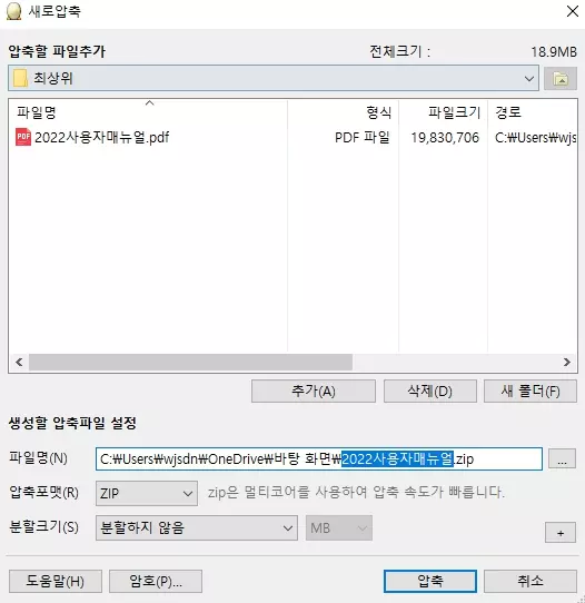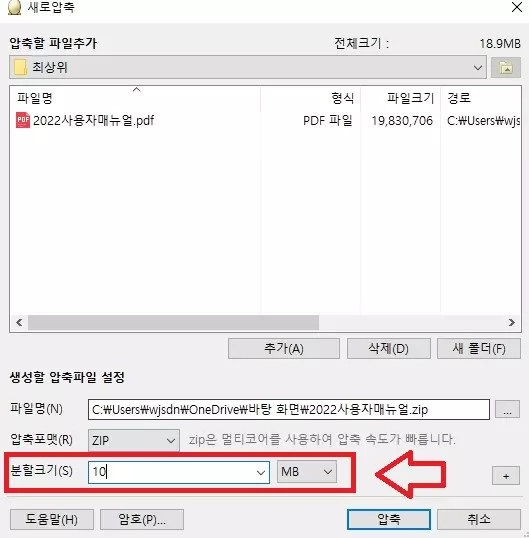 분할크기에서 압축 용량을 줄일 수 있습니다. (원하는 분할크기를 선택해도 가능합니다.)