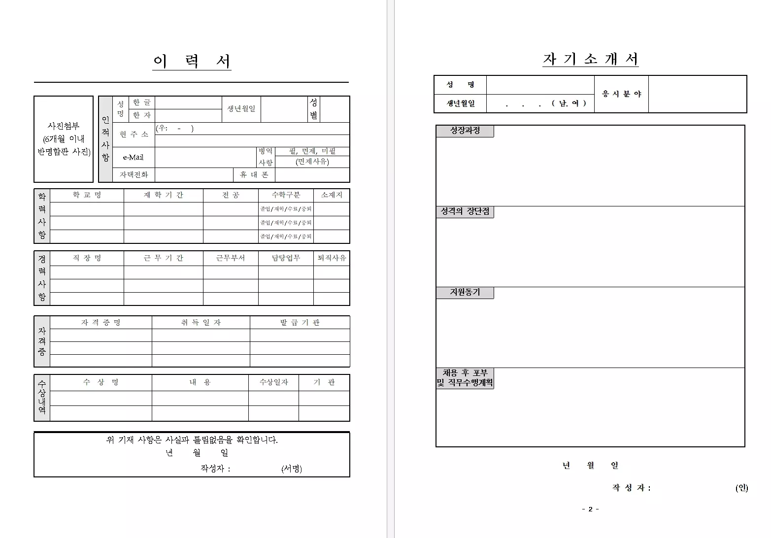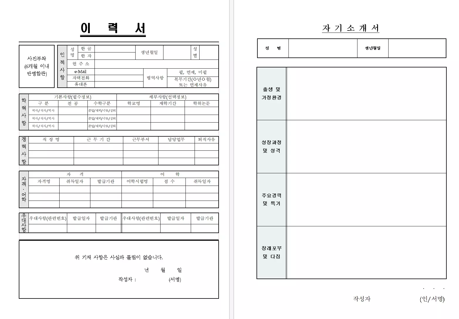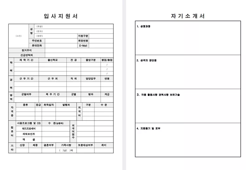 가장 흔하게 사용되는 회사제출용 이력서이고 이력서란과 자기소개란이 구분되어 있습니다.