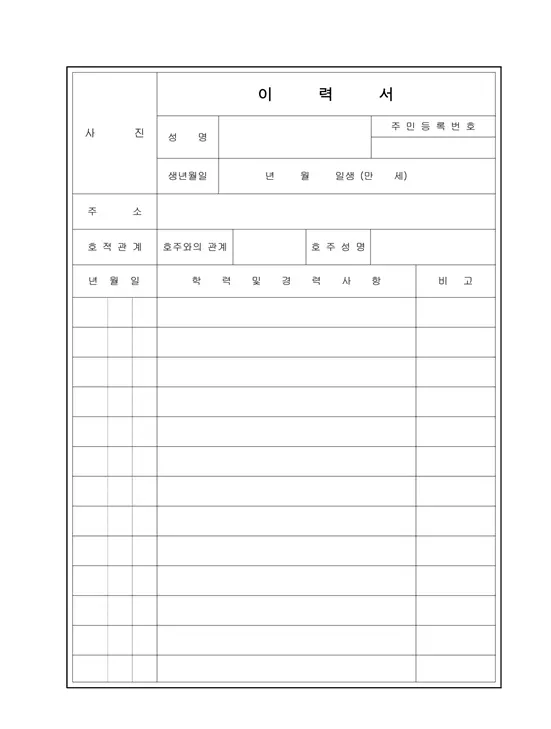 이력서의 양식은 다양하고 많습니다. 자신이 지원하는 회사에 제공하는 양식이 없다면 아래 올려드리는 양식을 다운로드하시고 빈 곳을 채워 제출하시면 됩니다.