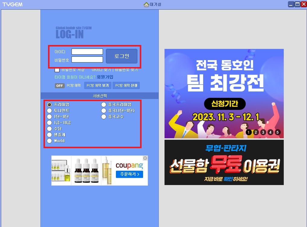 2. 아이디가 없는 분들은 회원가입을 해주시고 여기서 중요한 것이 서버선택입니다.