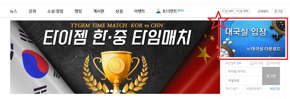 타이젬 바둑을 즐기기 위해선 먼저 홈페이지에서 대국실 다운로드를 먼저 진행하셔야 합니다.