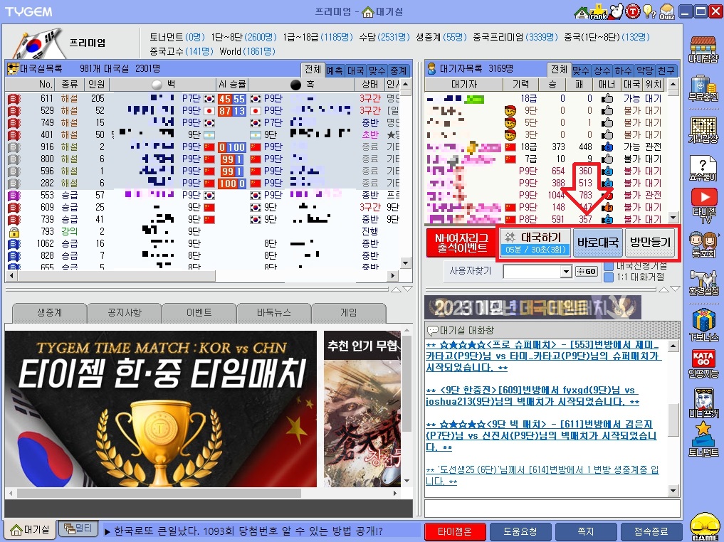 3. 프리미엄 대기실에 접속한 모습입니다. 바로 대국을 하고 싶은 분들은 바로대국을 클릭하여 바로 바둑을 둘 수 있습니다.