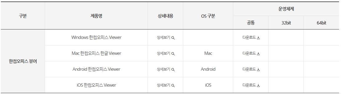 또한 한글 뷰어는 개인에게는 무료로 배포 또는 사용가능하니 아래 목록 확인 하시고 사용하고 싶은 프로그램을 다운로드하여 사용할 수 있습니다.