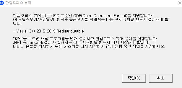 2. 한글 뷰어를 사용하기 위해서는 아래와 같이 visual C++ 2015 - 2019 Redistributable이 설치되어 있어야 합니다.