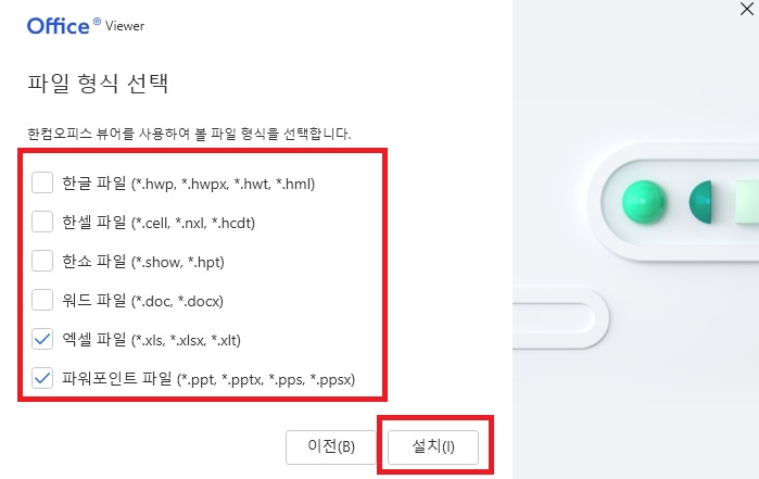 5. 오피스 뷰어는 여러 형태의 파일을 열람할 수 있습니다. 모든 파일을 체크하시고 설치 버튼을 클릭합니다.